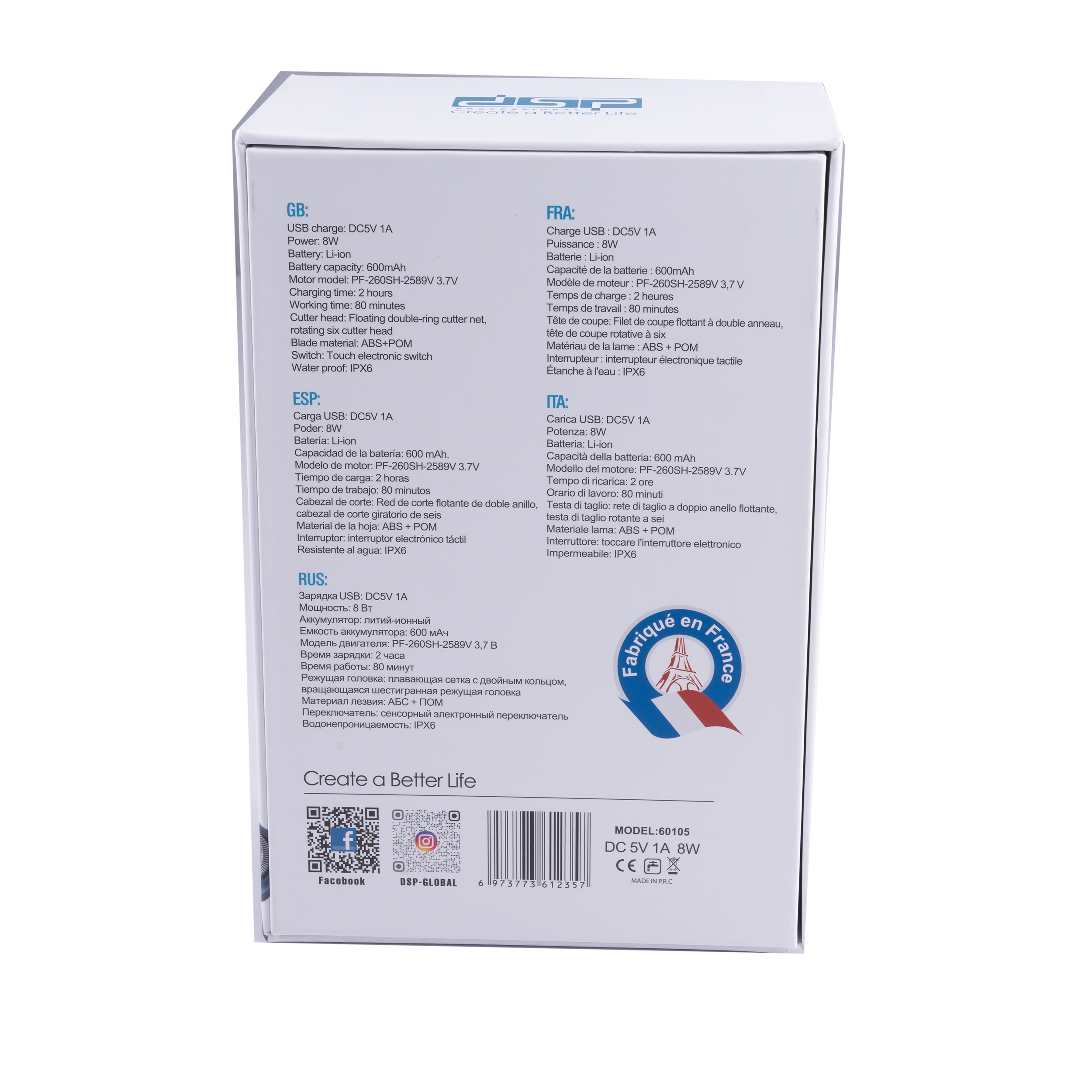 ریش تراش دی اس پی مدل 60105 از جدیدترین محصولات این کمپانی است. این دستگاه اصلاح موهای صورت، مجهز به باتری لیتیومی 600mAh است. این ماشین اصلاح، قابلشارژ است و داشتن کابل یو اس بی امکان شارژ کردن آن را در هر جایی به شما میدهد. طراحی منحصر به فرد ارگونومیک این ماشین اصلاح باعث شده بیشتر مورد توجه کاربران قرار گیرد. این ماشین اصلاح دارای 6 تیغه است که در برابر هوا و رطوبت از ماندگاری بالایی برخوردار و قابل شست و شوست. همچنین، این ماشین اصلاح دارای قابلیت اصلاح سر و صورت است. با استفاده از این قابلیت، شما میتوانید به راحتی و با دقت بالا موهای سر و صورت خود را اصلاح کنید. با این قابلیت، شما میتوانید ظاهری مرتب و بهروز داشته باشید و به سرعت و با دقت، موهای خود را به شکلی که میخواهید تغییر دهید. این ماشین اصلاح، دارای باتری قابل شارژ است که در مدت زمان 2 ساعت کاملاً شارژ شده و پس از آن، میتوان به مدت 80 دقیقه از ریش تراش استفاده کرد. همچنین ماشین اصلاح 60105 از تکنولوژی برش چرخشی بهره میبرد، که موهای سر و بدن را با مرز بندی مشخص کوتاه میکند. از ویژگیهای بسیار مهم این محصول نیز صفحه نمایش آن است که میزان شارژ باقی مانده را نشان میدهد. با داشتن این محصول، شما میتوانید به سرعت و با استایل، ظاهری دقیق و بهروز داشته باشید و همواره شیک و آراسته به نظر برسید.